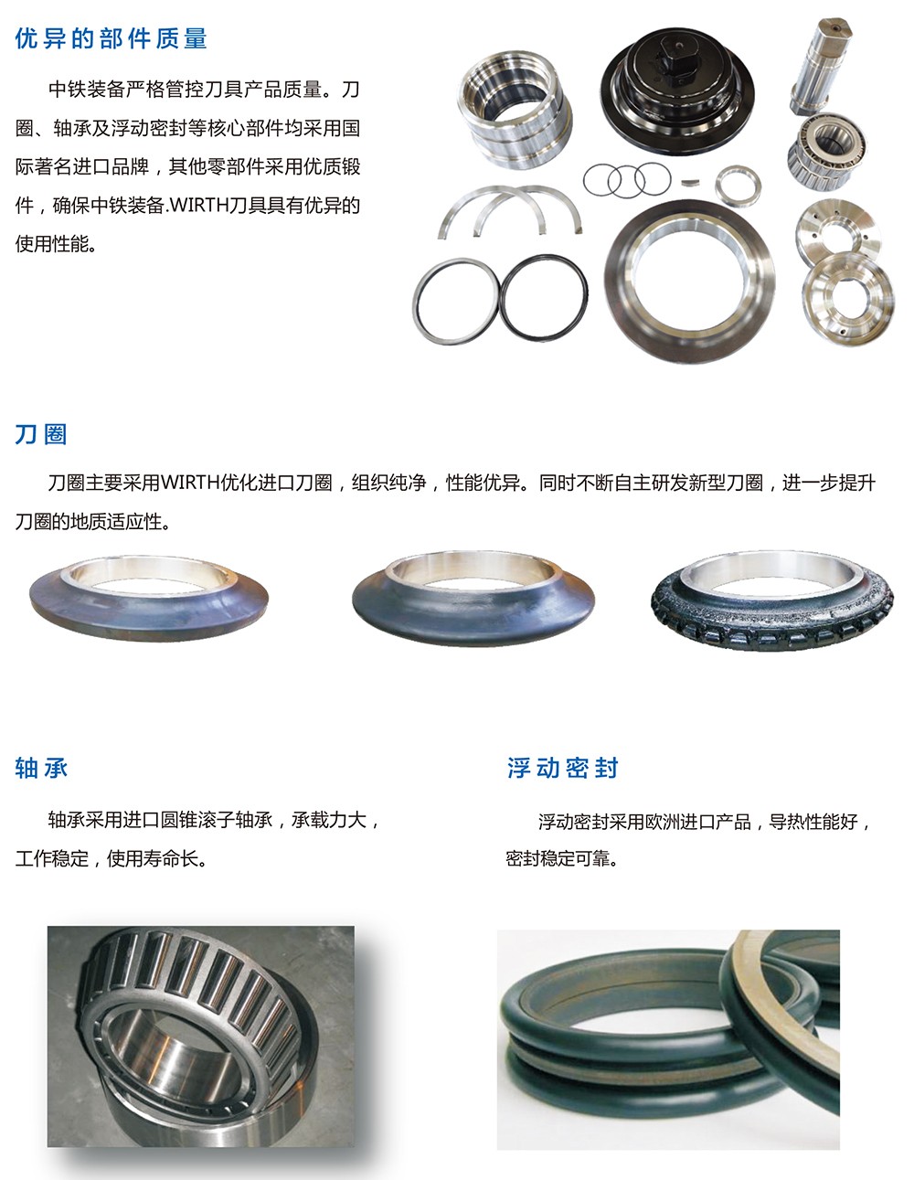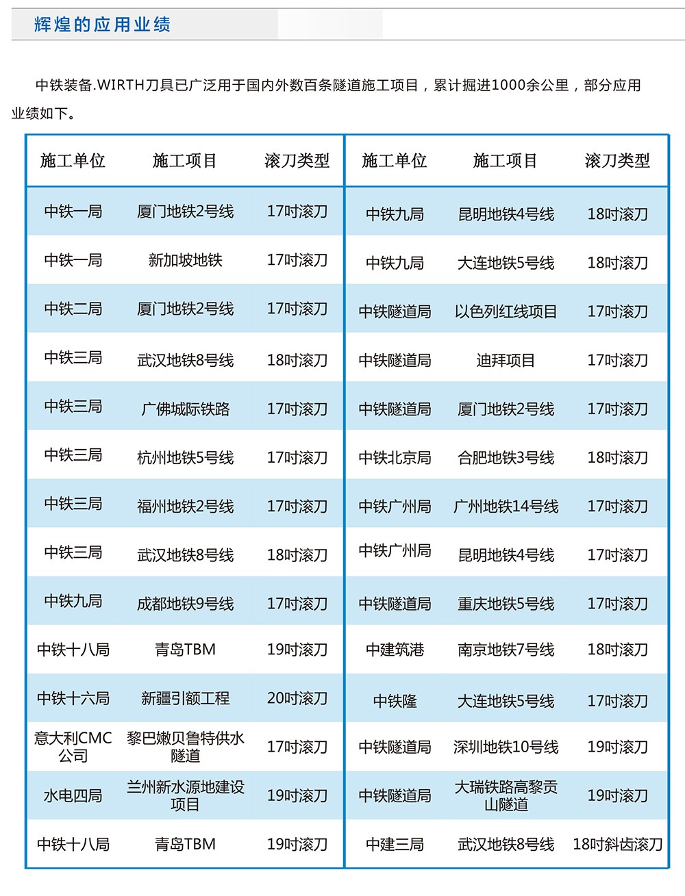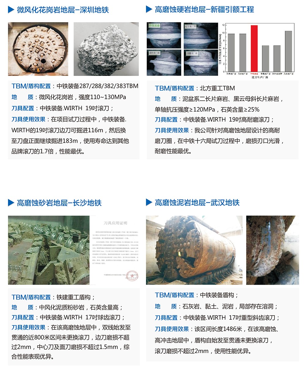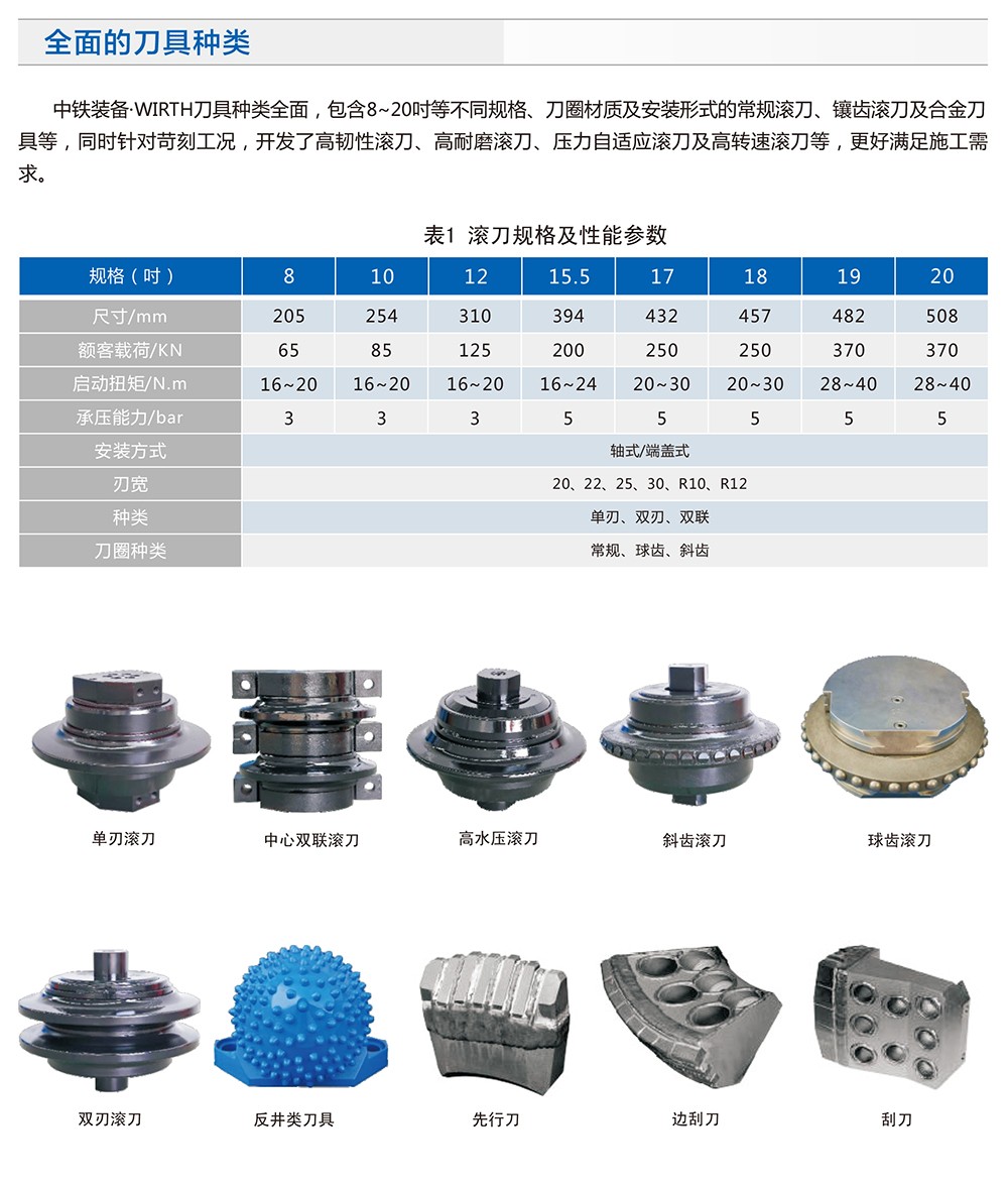 中鐵裝備集團設備公司在傳承德國WIRTH刀具先進設計、制造技術及全球2000余個項目使用經驗的基礎上,不斷開展研發創新工作,繼續保持刀具性能的領先優勢。目前中鐵裝備刀具產品涵蓋不同規格、刀圈材質及安裝形式的常規滾刀、鑲齒滾刀及盾構合金刀具等,可針對不同地層配置合理的刀具方案,滿足復雜、苛刻地層的施工需求。