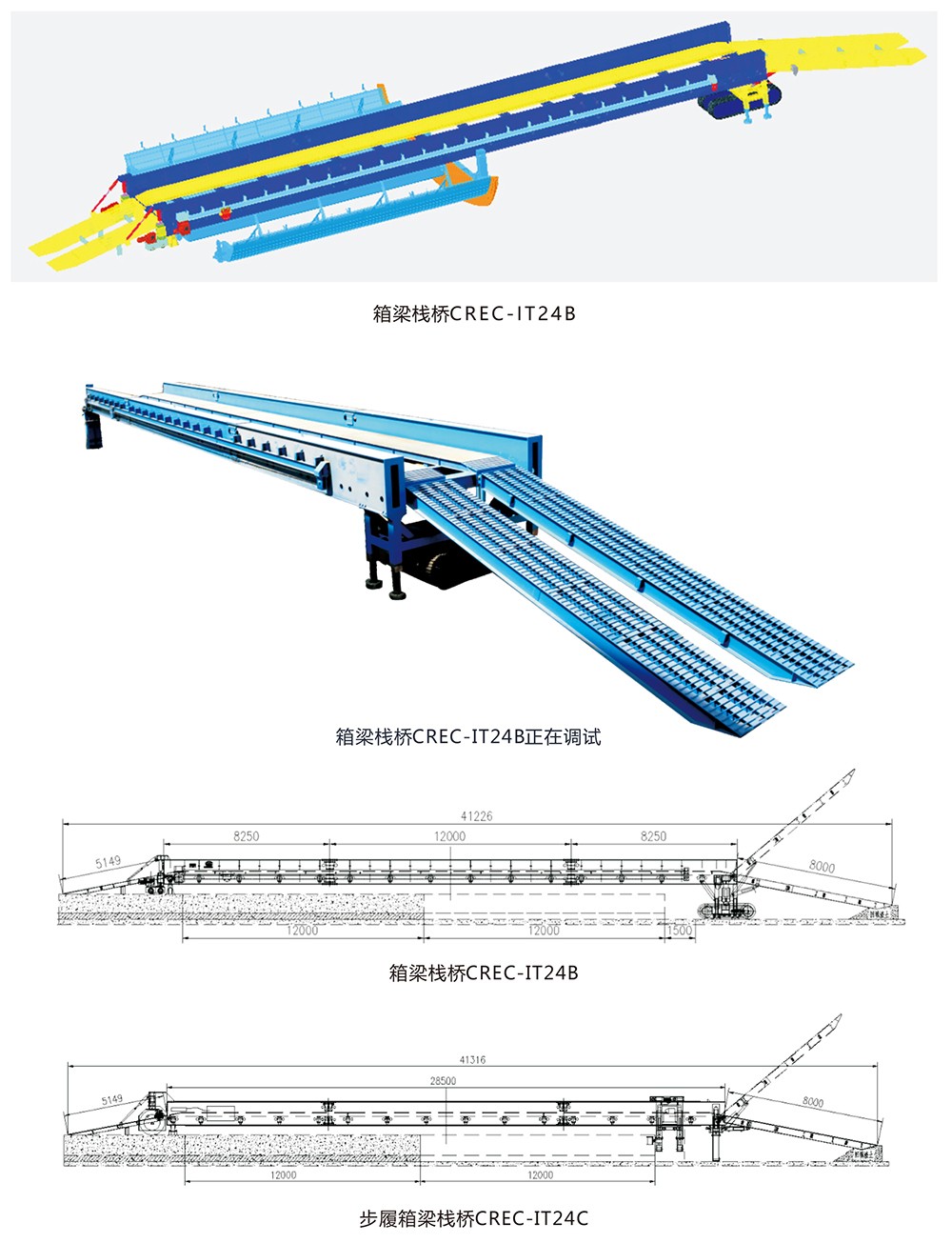 中鐵裝備自行式仰拱棧橋采用機電液一體化設計,自動化程度高,可適應多種開挖工況,能夠實現自動縱移、橫移、起升降落姿態調整,可拖移模板,目前提供履帶桁架棧橋CREC-IT24A、履帶箱梁棧橋CREC-IT24B和步履箱梁棧橋CREC-IT24C三種產品。